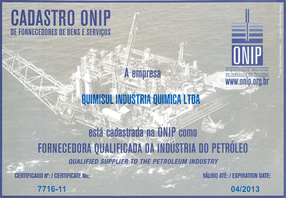 Certificado recebido pela nossa empresa da ONIP - Organização Nacional da Indústria do Petróleo.